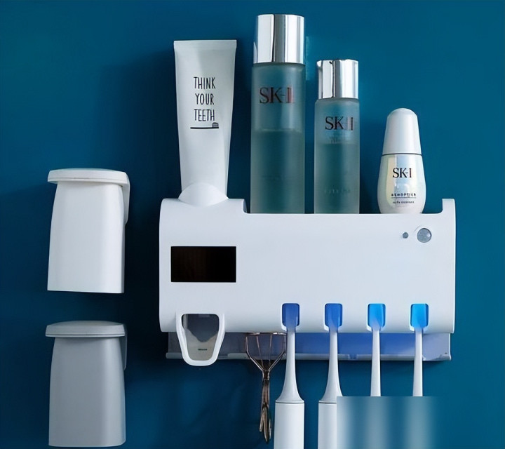 消毒架可太管用了:既能烘干牙刷新溅 的水汽,还能用紫外线消消毒,连牙刷杯、牙膏都能一起收在上面,台面一下子空了,再也不用对着堆得满满的洗手台发愁。